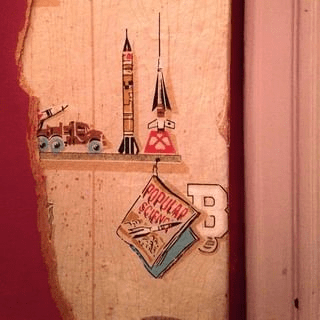 The re-exposed wallpaper of my childhood depicted a cartoony, Space Age scene of toy rockets and toy jets and toy army trucks carrying little missiles ready to launch. I had no conscious memory of that cutesy Cold War imagery until the moment I saw it again, and then the synapses sparked and the memory came rushing back. I remembered it instantly, and I remembered how much I liked it. There it was, that indulgence for the son born when mom was forty-seven, the miracle baby sent by Jesus to ease the pain of losing another child in infancy a few years before, the sister I never knew who my parents named Grace. This is what I gave them, I suppose, through no fault or intention of my own: one last chance to fill that room.