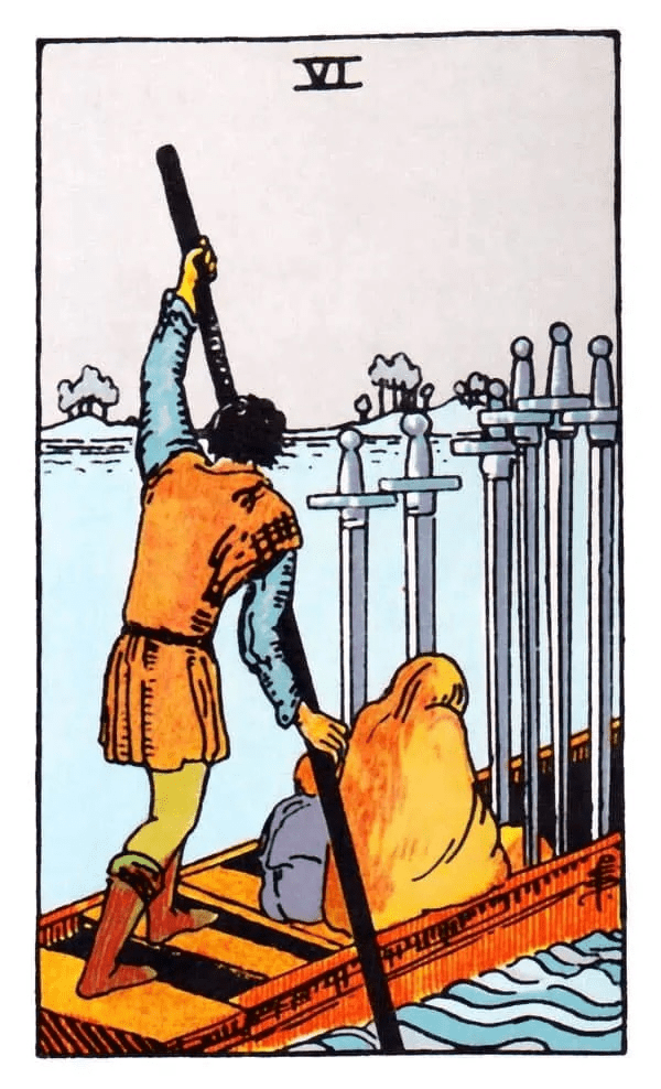 I was on my way that afternoon to the Sagrada Familia, the Gothic and Art Nouveau basilica, still unfinished then as now, which obsessed me with its cluster of sensuous curvilinear steeples. I liked to pass by the church each day and view it from different angles. I had never seen a stone structure that looked so organic, like a giant creature poised to leap across stately avenues. The church was still at some distance when I spotted the card on the cobblestones just ahead. I didn’t know much about the Tarot then – I still don’t – but the small rectangle of color popped against the grey pavement and caught my eye. On a whim, I picked up the card and examined it briefly. It was (I know now, because I have looked it up) the Six of Swords, and I held it upside-down for a moment before rotating it to examine the figures depicted on its face: a boatman standing like a gondolier behind a seated mother and child, pushing their boat forward with a pole. All three figures had their backs to the viewer and faced six large swords in the bow.